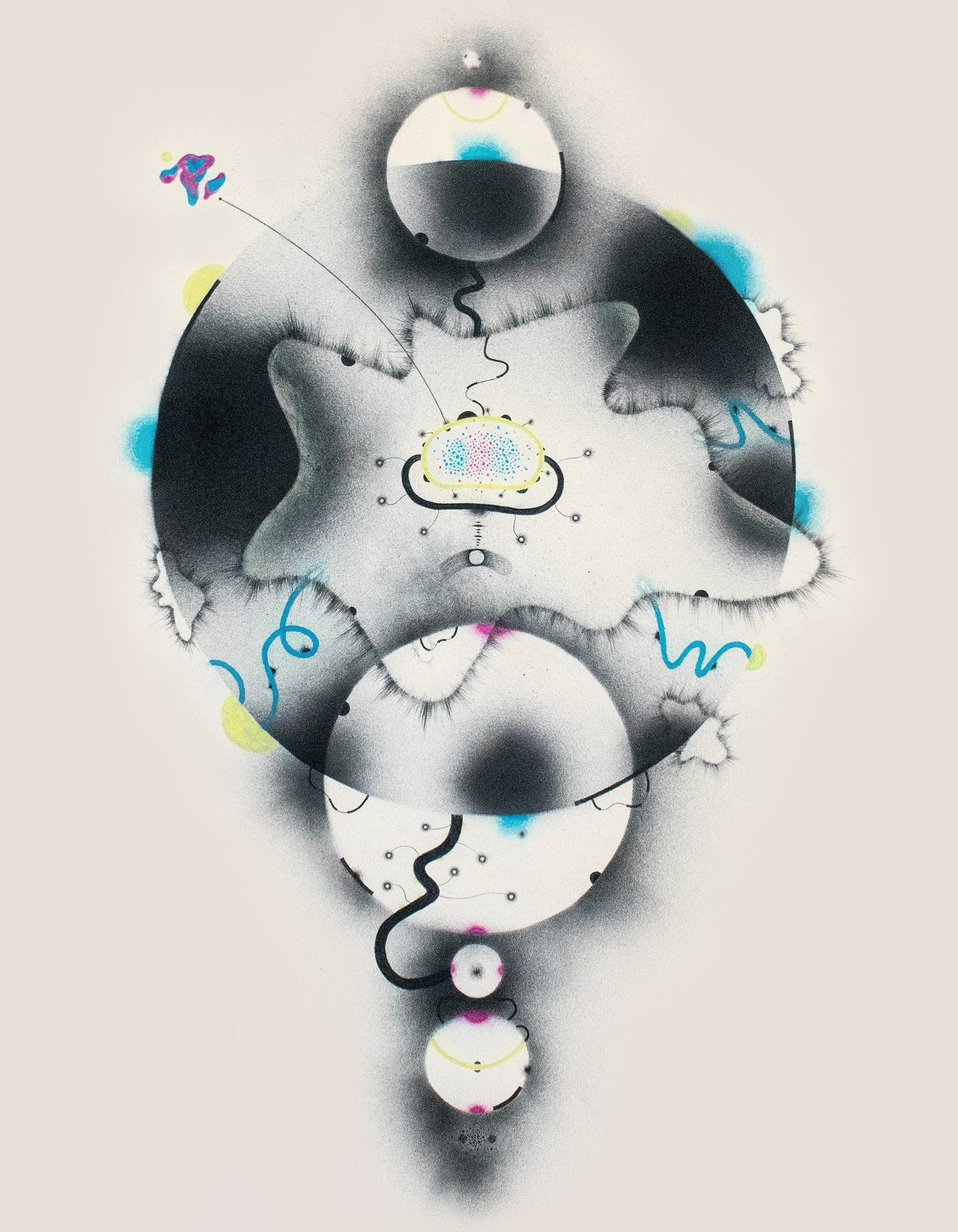 Spray paint, felt pen, acrylic, drawing ink, coloured pencil | 65,5 x 50 cm, 240 g/m² handmade paper | 2017